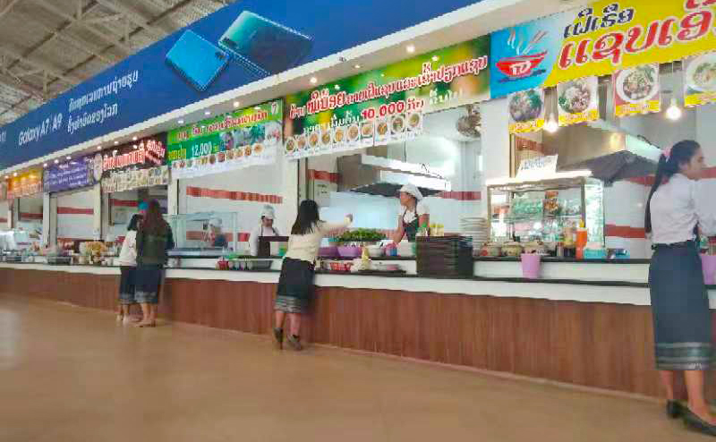 不同的食物由不同的窗口售賣,當(dāng)然打飯的窗口跟中國“玻璃窗后的阿姨似乎總有點(diǎn)手抖”不同,老撾國立大學(xué)的食堂窗口更像展會現(xiàn)場的攤位,制服統(tǒng)一的阿姨笑容滿面地等待你的到來。