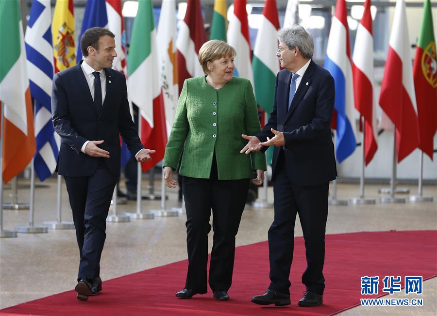 2月23日,在比利時首都布魯塞爾,法國總統(tǒng)馬克龍(左)、德國總理默克爾(中)和意大利總理真蒂洛尼抵達(dá)峰會會場。