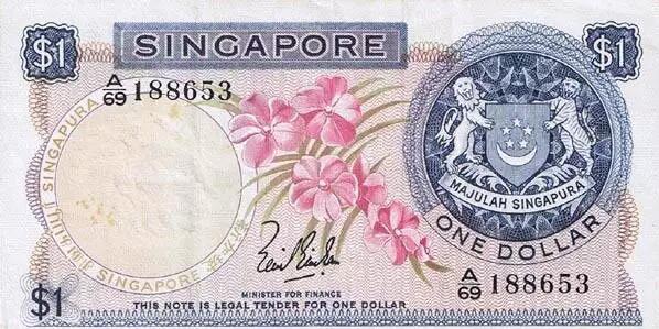 自 1965 年新加坡從馬來亞聯(lián)邦中退出并宣告獨(dú)立的兩年內(nèi),新加坡依舊使用著馬來亞與英屬婆羅洲元。直到 1967 年,原“馬來亞與英屬婆羅洲貨幣委員會(huì)”停止發(fā)行馬來亞與英屬婆羅洲元,新加坡才于當(dāng)年開始發(fā)行本國(guó)的鈔票“新加坡元”,簡(jiǎn)稱新元或新幣。