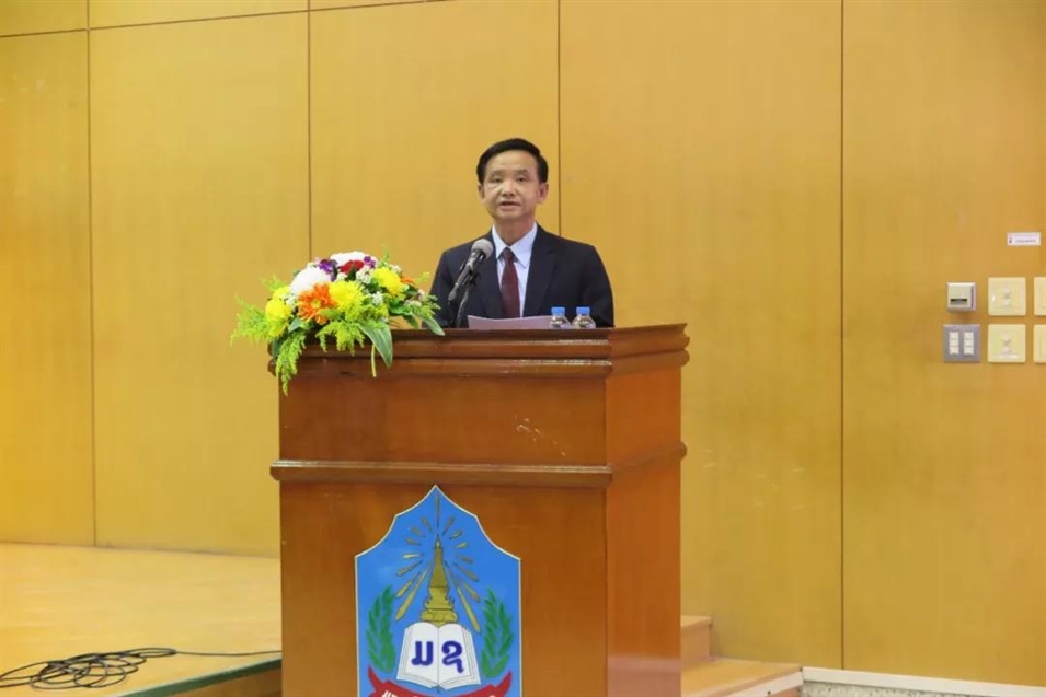 老撾國立大學(xué)副校長洪佩·占塔馮致歡迎辭。他代表老撾國立大學(xué)全體師生對許琳參事及代表團(tuán)一行到來表示熱烈歡迎!洪佩·占塔馮副校長回顧了老撾國立大學(xué)孔子學(xué)院從建立到快速發(fā)展的歷程。他說,許琳參事在任孔子學(xué)院總部總干事、中國國家漢辦主任期間,對老撾國立大學(xué)孔子學(xué)院的發(fā)展給予了熱情關(guān)懷,并大力推動“中國政府援老撾國立大學(xué)孔子學(xué)院項目”的落實,他代表國立大學(xué)對許琳參事表示衷心感謝!他同時還表示,許琳參事本次講座的主題非常有意義,對教育全球化的發(fā)展提出了機遇和挑戰(zhàn),也有利于促進(jìn)老撾國立大學(xué)鏈接區(qū)域與國際的未來發(fā)展。